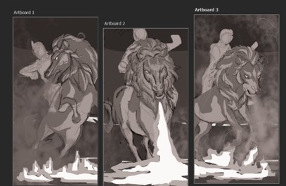 With the horses and riders pieces, I have begun to add some texture to the background and clean up my line work with more refined brush strokes.